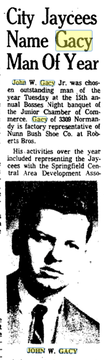 "Gacy Honored by Jaycees," Illinois State Register, Springfield, Ill,11 May 1964, p3, column 4; imaged, GenealogyBank (https://www.genealogybank.com/nbshare/AC01210325033932249981716488768 : accessed 23 May 2024).